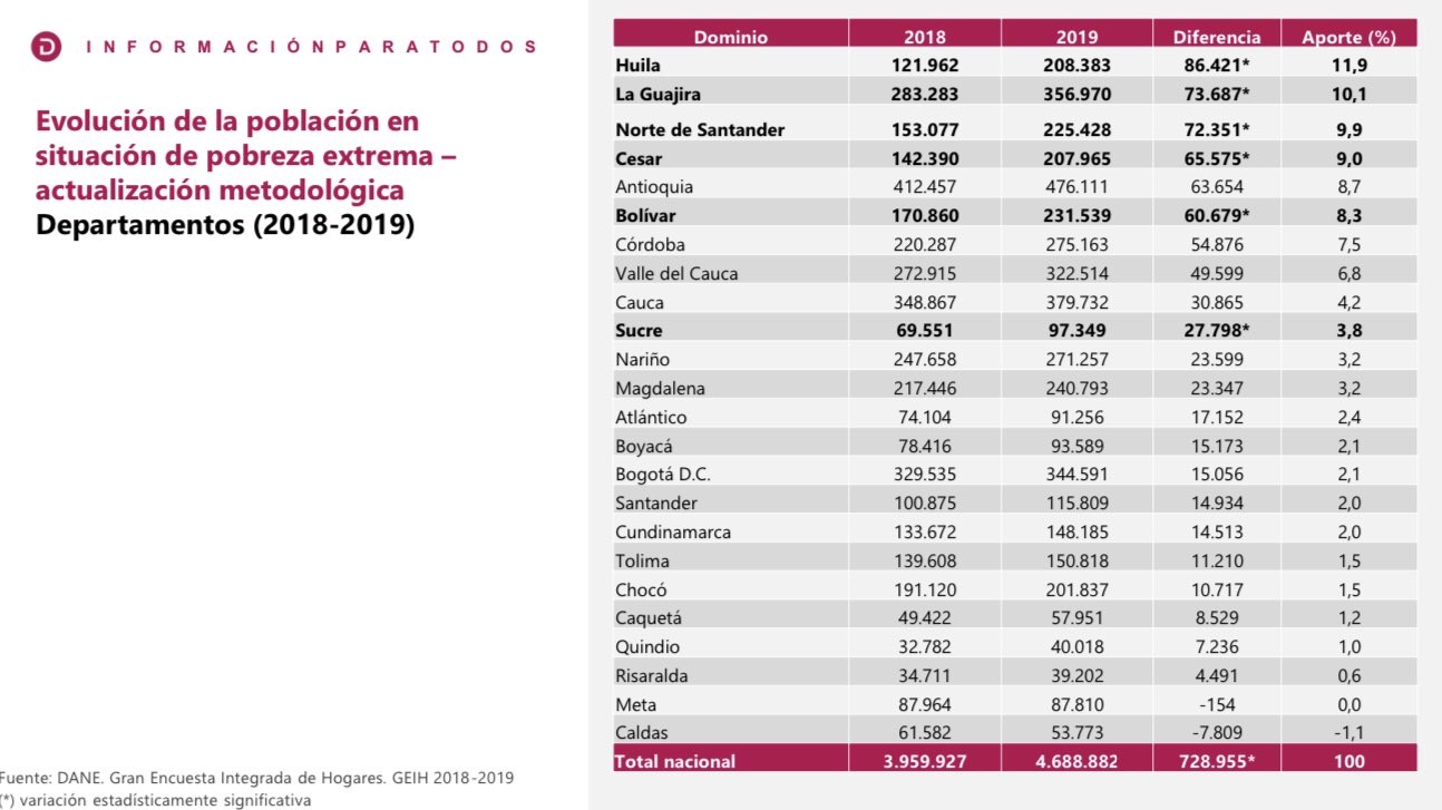 Entre 2018 y 2019, en Colombia, 728.955 personas ingresaron a la situación de pobreza extrema. #Huila aportó 11,9 % a este incremento, lo que corresponde a 86.421 personas. #Caldas tuvo una reducción de 7.809 personas en esta situación.