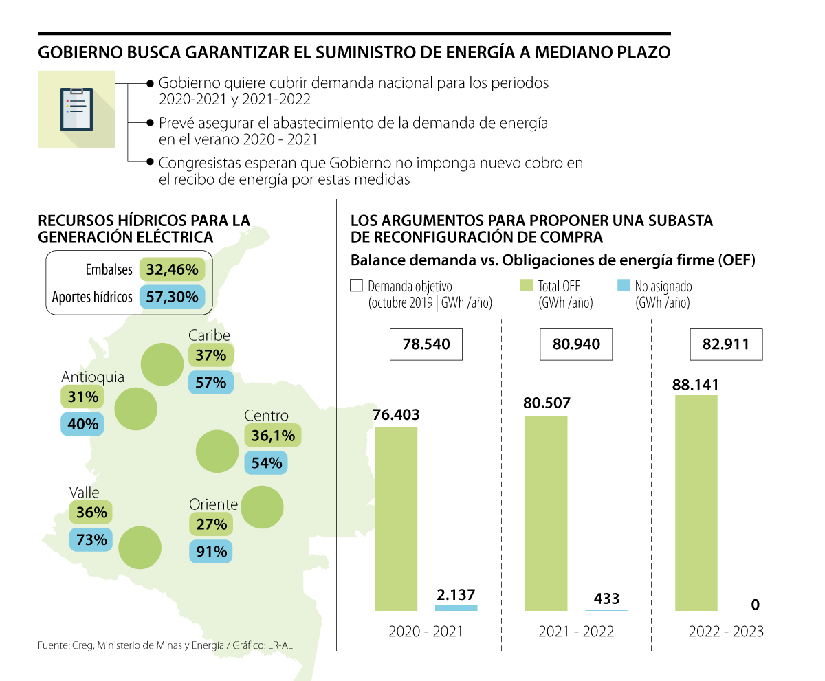 Uno se trata de una posible subasta de reconfiguración de compra y el otro es la alternativa de intervenir el mercado de las hidroeléctricas. Las dos alternativas, si bien están en un periodo de comentarios, serían fundamentales para cubrir los posibles riesgos que se presentarían no solo a finales de este año, sino, además, en el periodo entre 2021 y 2022.