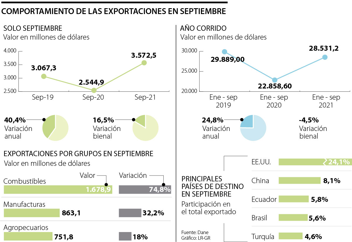 El Departamento Administrativo Nacional de Estadística (Dane), reveló que en septiembre las exportaciones alcanzaron US$3.572,5 millones y subieron 40,4% anual y 16,5% frente a igual periodo de 2019.