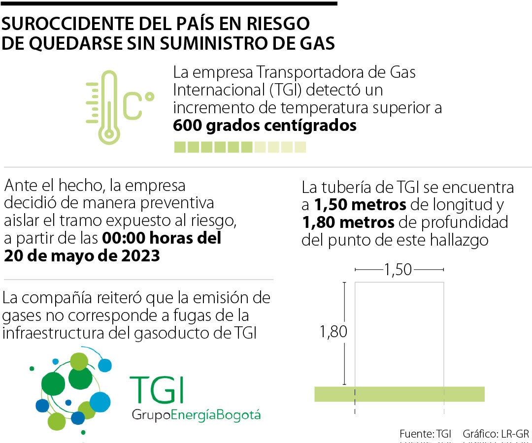 TGI detectó una temperatura alta debido a una condición anormal que podría afectar la integridad de la tubería. Ante el hecho, la empresa que opera el gasoducto Mariquita-Cali aisló uno de los tramos. Se aplicó una restricción desde las 00:00 horas del sábado 20 de mayo en el paso de gas natural en el tramo Mariquita – Cali PK 57+800.
