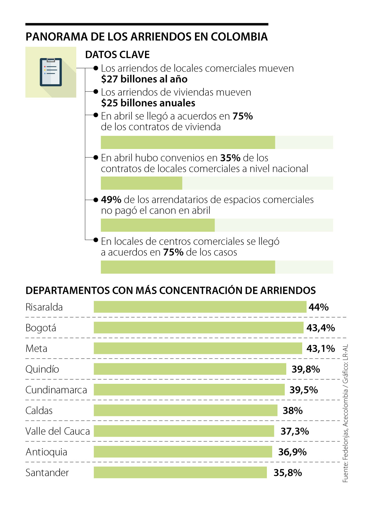 Según Carlos Betancourt, director ejecutivo de Acecolombia, de 41.000 locales que componen los centros comerciales del país, más de 30.900 han hecho acuerdos con la inmobiliarias y propietarios sobre los pagos del arriendo, lo que equivale a 75%. “Entendemos que el Gobierno está adelantando la búsqueda de mecanismos que promuevan los acuerdos y establezcan lineamientos claros que generen incentivos para lograr acuerdos equitativos y solidarios, lo que será clave en el proceso de reactivación del sector inmobiliario y el comercio en general”, dijo.