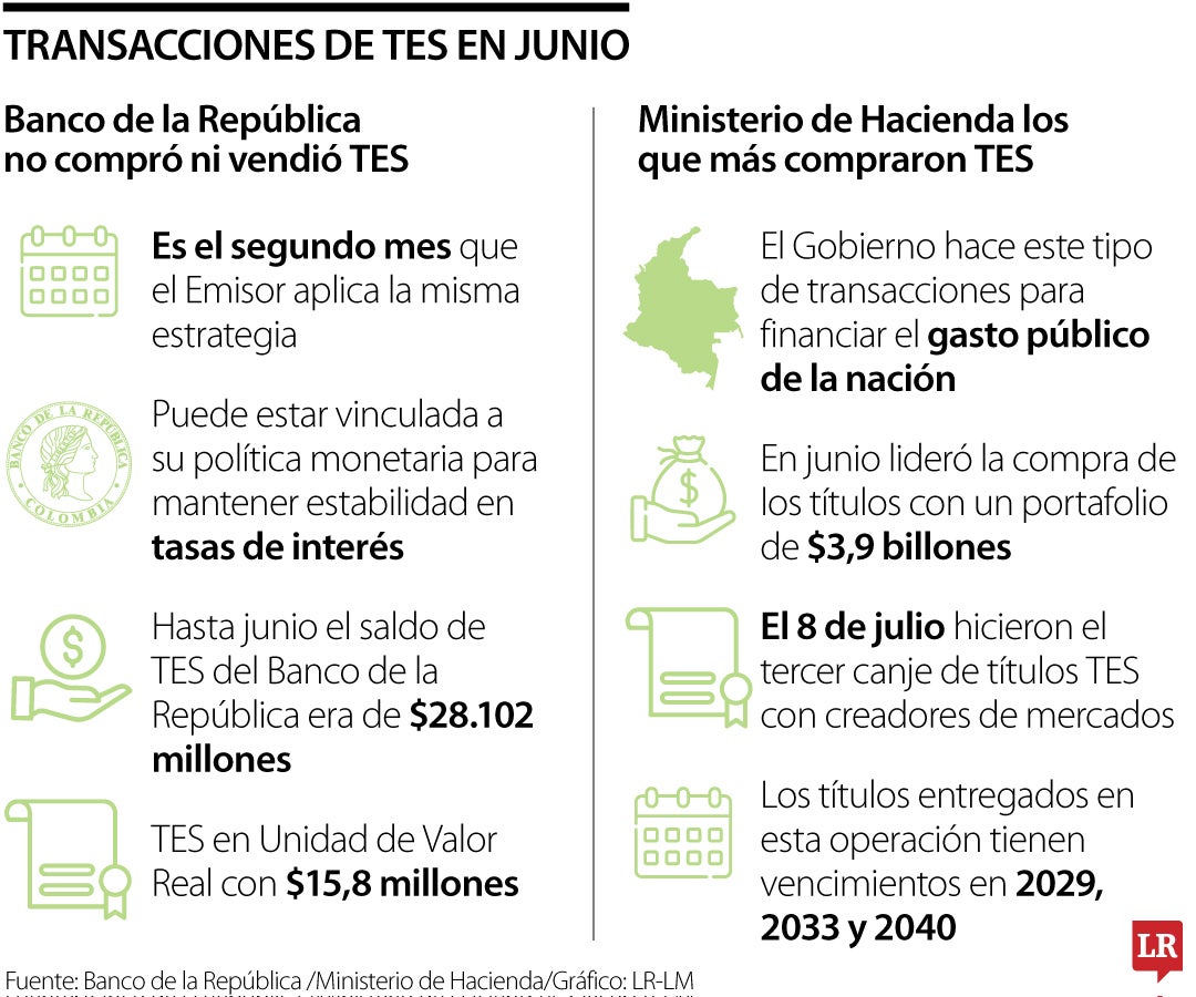 Mientras el Banco de la República ha decidido estos meses en no comprar ni vender títulos TES B, vinculado a sus decisiones en el marco de su política monetaria, el Ministerio de Hacienda es la entidad pública que a junio lidera la de compra de estos títulos de deuda pública con un portafolio de $3,9 billones al cierre del primer semestre. El Gobierno está centrándose en estas operaciones para financiar el gasto público de la nación.