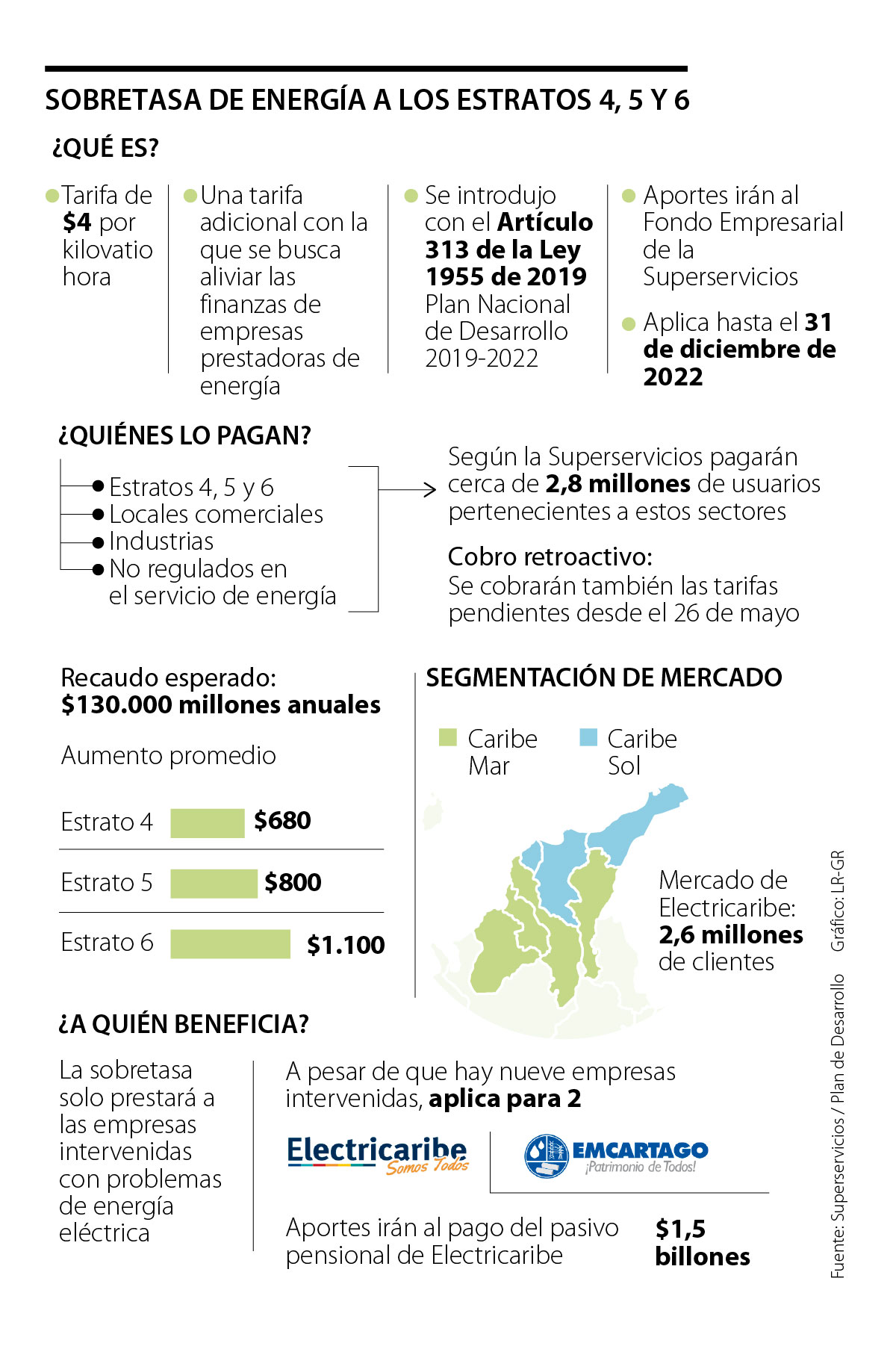 Dentro de las cuentas que se esperan apoyar con el recaudo de la sobretasa está el pasivo pensional de Electricaribe. A pesar de que inicialmente se había calculado en $1,2 billones, la Superservicios reveló la semana pasada que en realidad corresponde a $1,5 billones. Por otro lado, Avendaño reveló que se asignaron $800.000 millones para invertir en infraestructura en la región Caribe, con lo que se beneficiarán a 2,6 millones de usuarios.