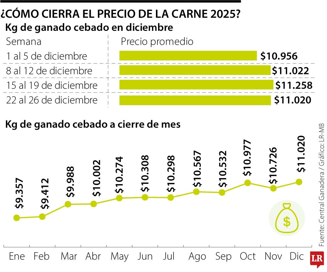 A dos días de que se acabe el año, vale preguntarse: ¿cómo cambió el precio de la carne para los productores? Y aunque la respuesta podría ser que entre la última semana de enero y la última semana de diciembre el precio promedio del kilogramo de macho cebado subió $1.663 o 17,77%, hay varios factores detrás que lo determinan.