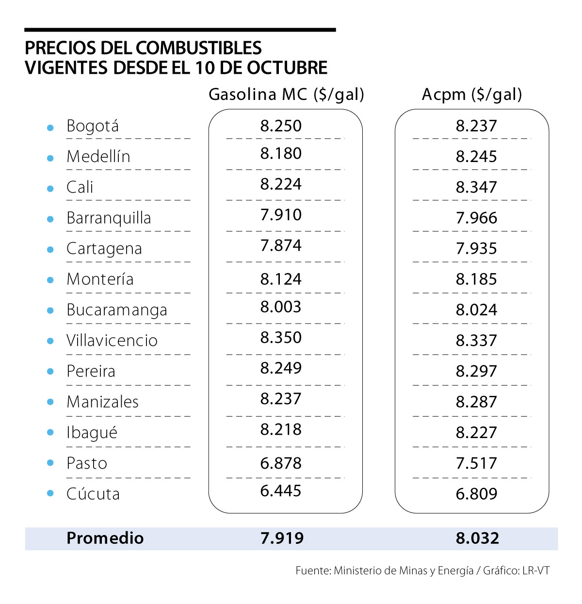 Entre tanto, el precio del diésel (Acpm) seguirá, en promedio, en $8.032 por galón en las 13 principales ciudades de Colombia.