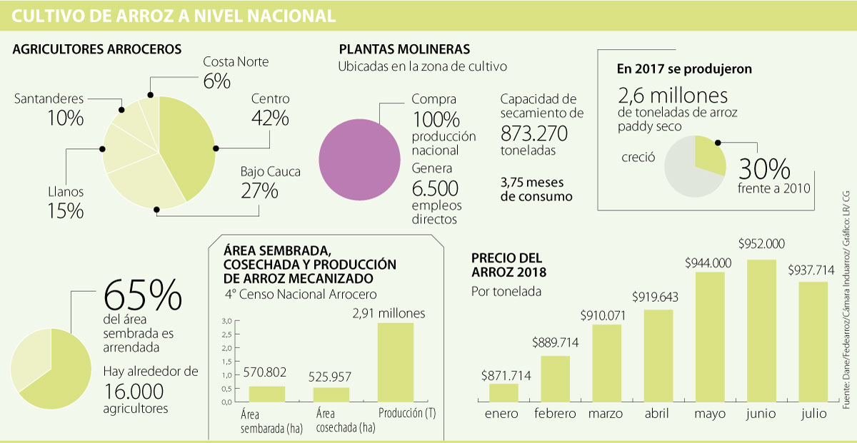 Actualmente, el arroz concentra 8% del área agrícola nacional y es el segundo cultivo de ciclo corto en importancia después del maíz. Además, genera alrededor de 420.000 jornales, que representan unos 85.000 empleos. A finales de julio, comienza a recolectarse la parte más importante de la cosecha de arroz, procedente de la región del Meta y Casanare, cuyas siembras ascienden a unas 189.000 hectáreas, de acuerdo con el censo del Dane para esta región. Sin embargo, la cifra está por debajo en 57.000 hectáreas a la registrada en 2017, que alcanzó una cifra sin precedentes.