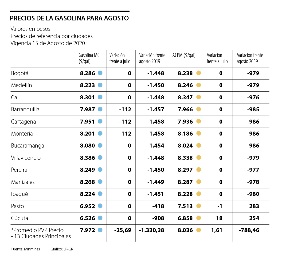 Por el lado del ACPM, el precio promedio para las 13 ciudades tuvo una subida de $2 frente a julio, al quedar en $ 8.036 por galón. Nuevamente, el comportamiento del precio de este combustible se explica por una sola ciudad, ya que en Cúcuta hubo un incremento de $18, al pasar de $6.840 en julio a $6.858 en agosto.