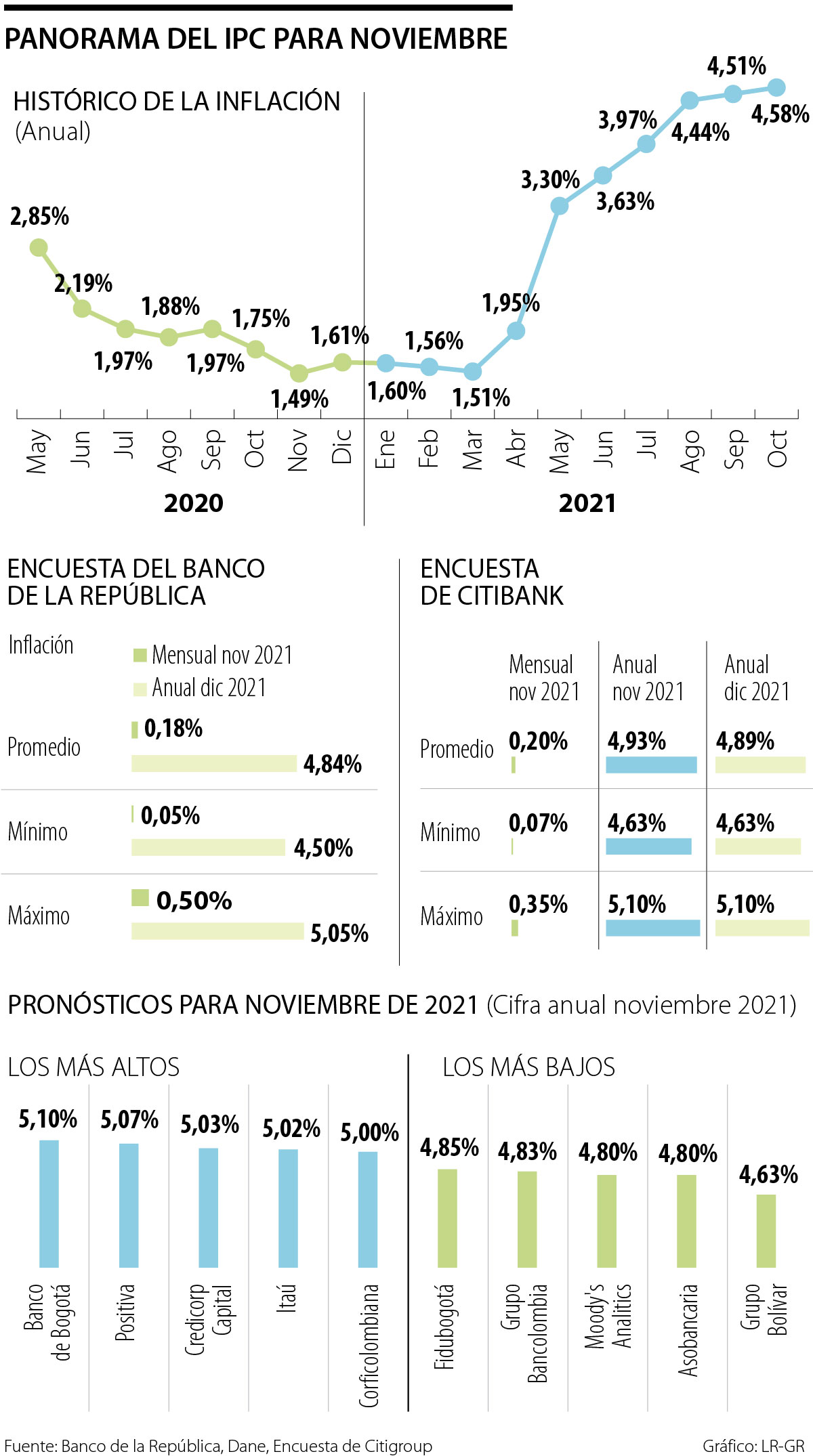 En cuanto a la variación mensual, los analistas esperaban que, en promedio, el IPC se mantuviera en 0,20% en el mes de noviembre. Entre los pronósticos más altos están los del Banco de Bogotá (0,35%) y Positiva (0,32%); y en los más bajos, los del Asobancaria (0,07) y Grupo Bancolombia (0,09%).