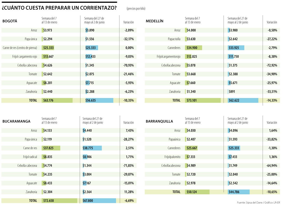 Para hacer este cálculo se tomaron los precios del Sipsa por kilos de los alimentos básicos para hacer un corrientazo en diferentes centrales de abasto en Bogotá, Medellín, Barranquilla y Bucaramanga, tales como carne de res, papa, arroz, fríjol, cebolla, tomate, aguacate y zanahoria.