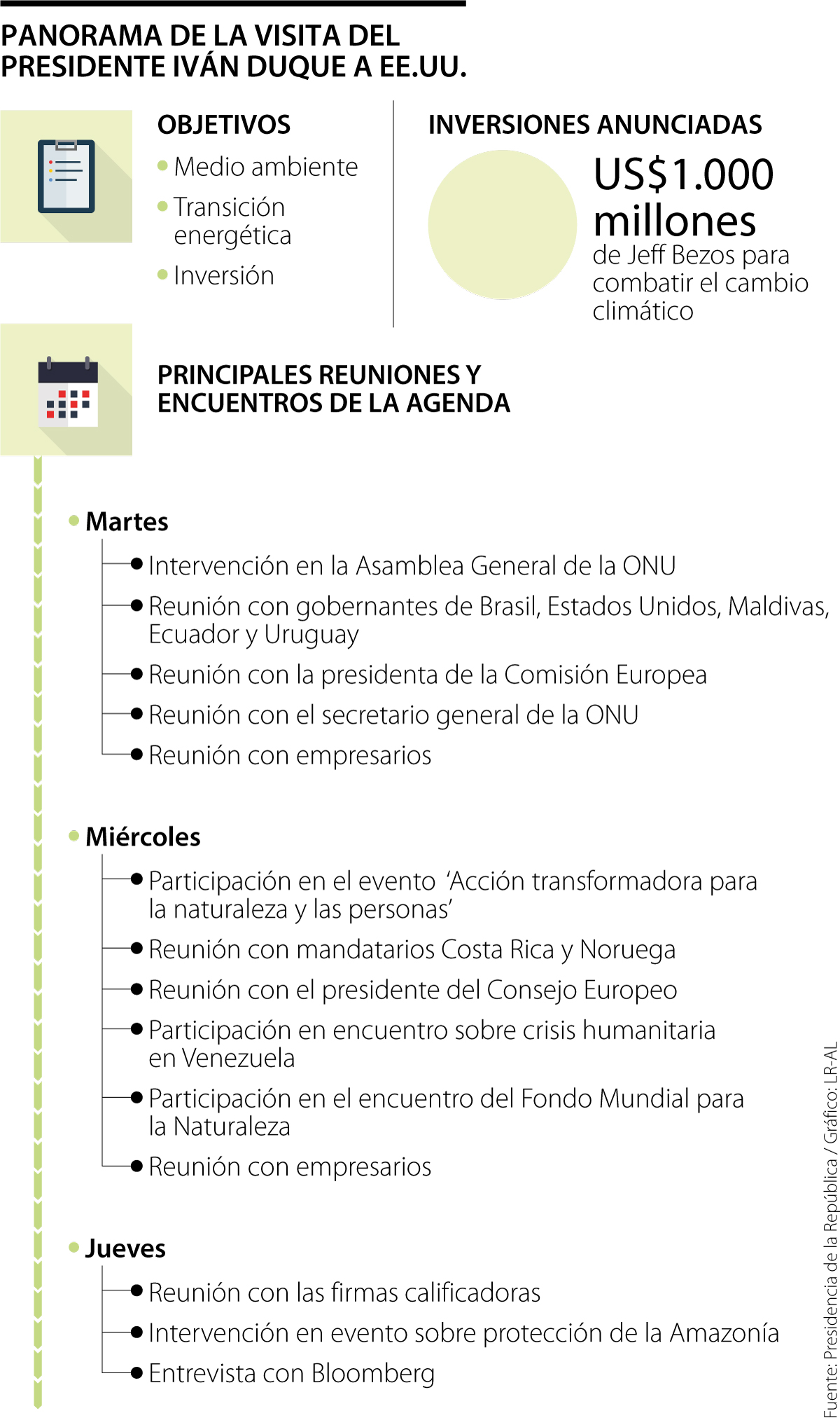 El presidente de la República, Iván Duque, adelantará hasta el próximo jueves una visita oficial a Estados Unidos con el objetivo de atraer inversiones al país en medio ambiente, transición energética, tecnología, innovación, alimentos y bebidas, pero también para participar en la Asamblea General de la Organización de las Naciones Unidas, ONU, y para reunirse con las agencias calificadoras que recientemente le quitaron el grado de inversión a Colombia.