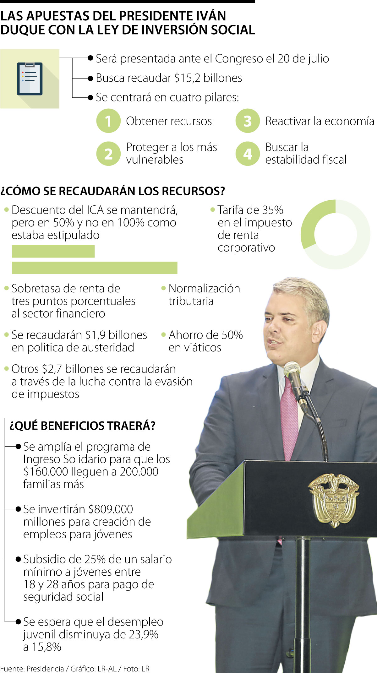 Frente al recaudo de los recursos, Duque indicó que se mantendrá el descuento del ICA en 50%, no en 100% como se planteaba en la Ley de Crecimiento. Con esta medida, asegura, se lograría un recaudo de $3,9 billones. Asimismo, resaltó las acciones del sector privado, con el que acordó aumentar la tarifa de renta a 35%, aún a pesar de la pandemia, para una sobretasa de 2% que generará un recaudo de $392.000 millones (precios de 2023).