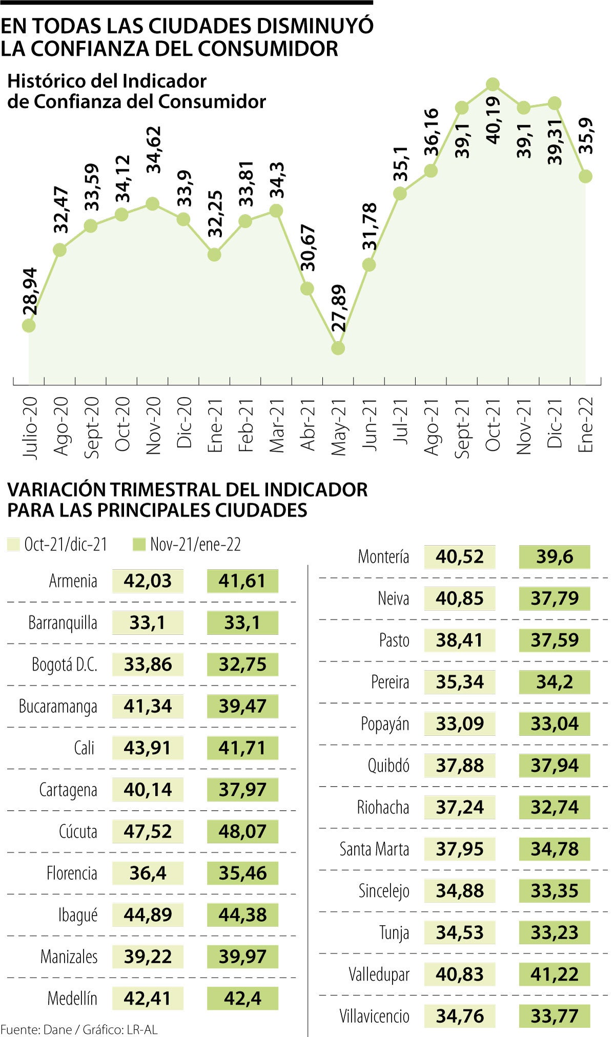 Este viernes el Departamento Administrativo Nacional de Estadística (Dane) reveló que la confianza de los consumidores cayó en enero. Este indicador pasó de 39,3 en diciembre a 35,9. El principal factor que explicó este deterioro fue la expectativa de la situación económica del hogar y del país para los próximos 12 meses. Después de haber tenido una expansión progresiva, el indicador decayó hasta los niveles de agosto.