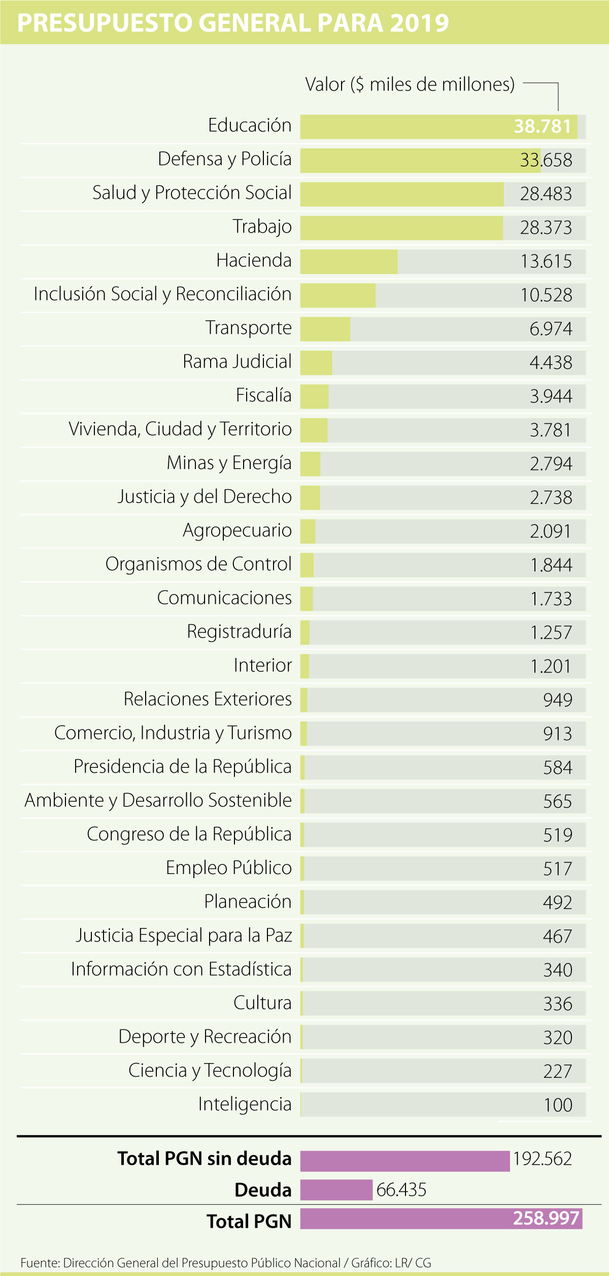 El Ministerio de Hacienda radicó el proyecto de Ley del Presupuesto General de la Nación para la vigencia de 2019 en la Comisión Cuarta de la Cámara de Representantes. El monto que tiene proyectado para que empiece a trabajar la administración entrante es de $259 billones, lo que implica un crecimiento de 10,9% frente al que está vigente este año. Si se excluye el gasto de la deuda ($66,4 billones), el valor total entre gasto e inversión será de $192,5 billones.