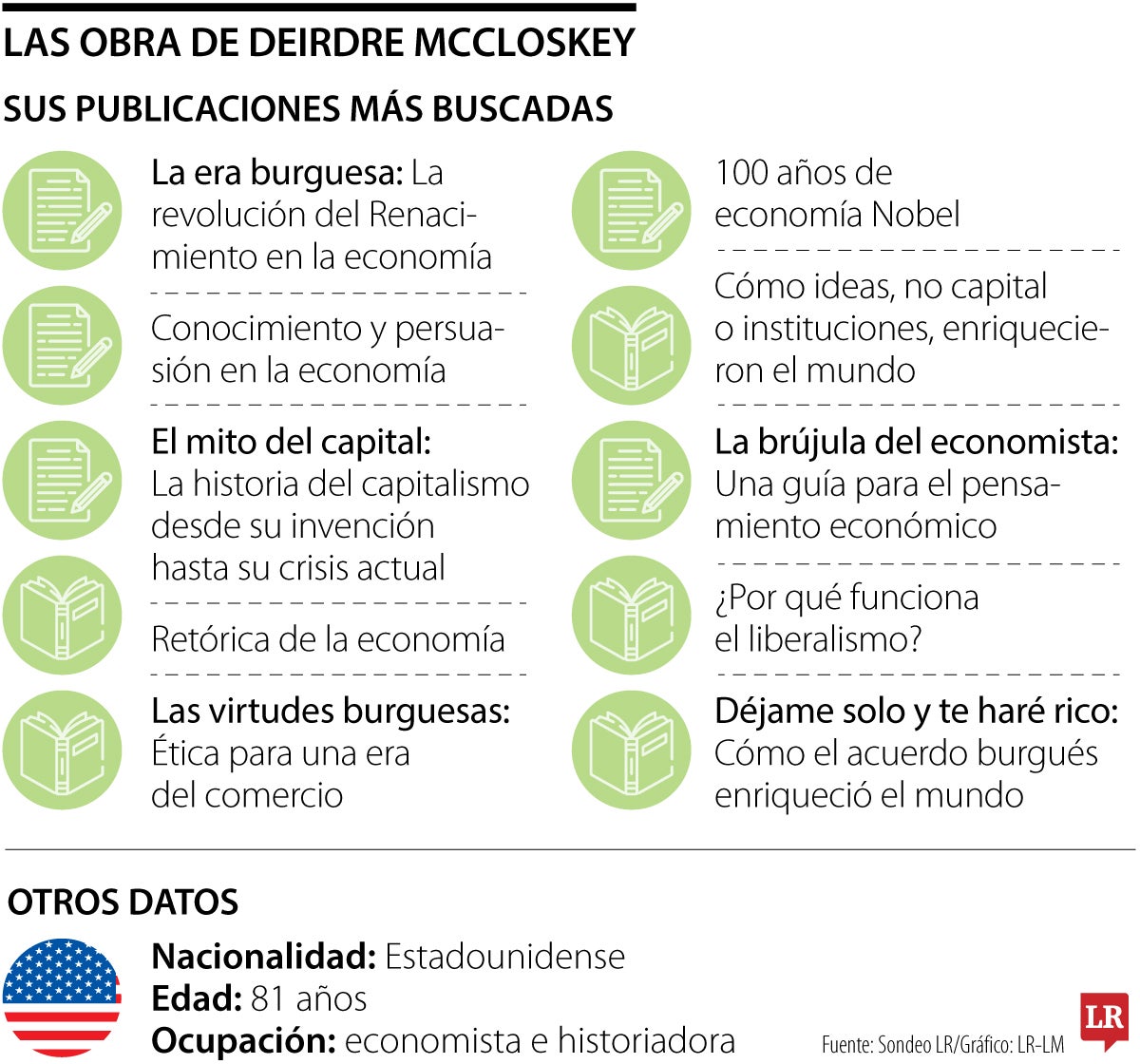 Deirdre McCloskey se ha ganado un puesto entre las académicas económicas más importantes en el ámbito internacional. Entre sus múltiples obras se cuestionan los fundamentos básicos de esta ciencia social, y propone salirse del esquema del método científico, con el fin de integrar una visión más amplia a través de la historia, la filosofía o la retórica.