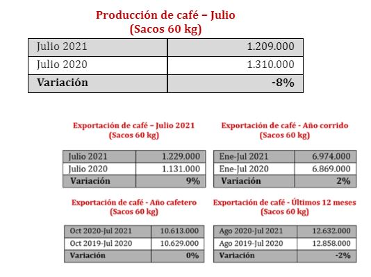 En cuanto a las exportaciones de café de Colombia, en julio siguieron recuperando el terreno perdido por la pandemia y los bloqueos y crecieron 9%, a 1,2 millones de sacos de 60 kg de café verde, frente a los 1,1 millones exportados en el mismo mes de 2020.En lo corrido del año (enero-julio), las exportaciones alcanzaron casi 7 millones de sacos, 2% más que los casi 6,9 millones exportados en el mismo periodo del año anterior.