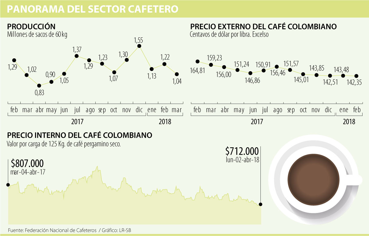 Aunque los datos de marzo fueron alentadores, las cifras revelan que las medidas para impulsar al sector son pertinentes. Entre el primer trimestre de 2017 y el mismo periodo de 2018, el precio internacional de referencia para los cafés suaves cayó 16,2%, sumado al retroceso de 8,1% en la producción colombiana del grano entre octubre de 2017 y marzo de 2018 y el mismo periodo del año anterior, cuando se pasó de 7,9 millones de sacos a 7,3 millones de sacos.