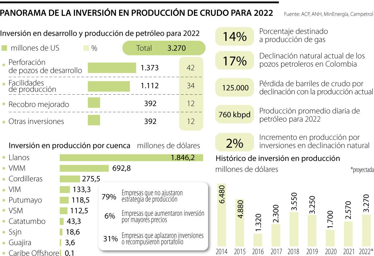 En estos términos, las inversiones destinadas a la producción, previstas en US$3.270 millones, darían paso a mitigar parte de la declinación natural de los campos e incrementar en 2% la producción anual.