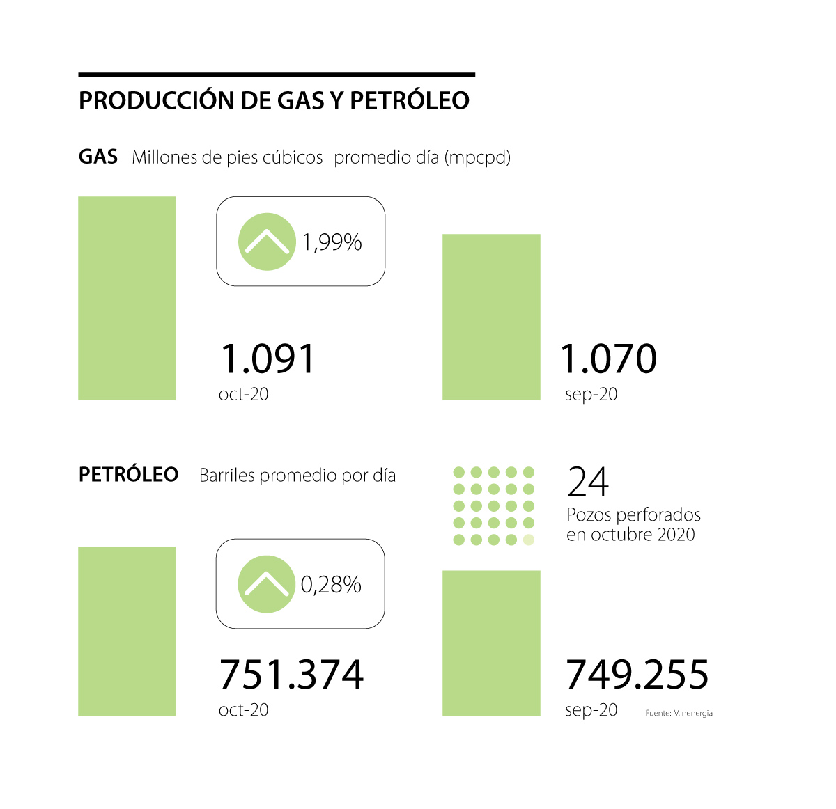 De acuerdo con los resultados presentados por el Ministerio de minas y Energía sobre la producción de gas y petróleo en el último mes y en lo corrido del 2020, se supo que, la producción comercializada de gas en Colombia fue de 1.091 millones de pies cúbicos por día (mpcd) en octubre de 2020, lo que significa un aumento de 1,9% frente a lo registrado en septiembre pasado que fue 1.070 mpcd. En comparación con octubre de 2019 cuando se registraron 1.112 mpcpd, la producción de este energético tuvo una disminución de 1,8%.