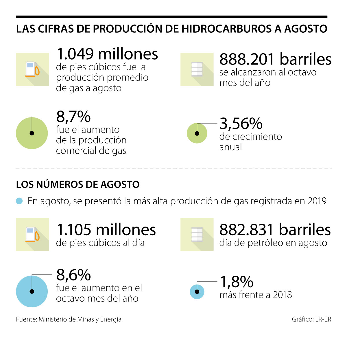 Pese a que el gas alcanzó buenos indicadores en lo corrido del año y el mes, en materia de crudo también se logró un alza en producción: tanto entre enero y agosto, como tan solo en el mes. De acuerdo con el Ministerio, en el octavo mes del año se llegaron a 882.831 barriles día, cifra que representó un incremento de 1,8% en comparación con el año pasado.