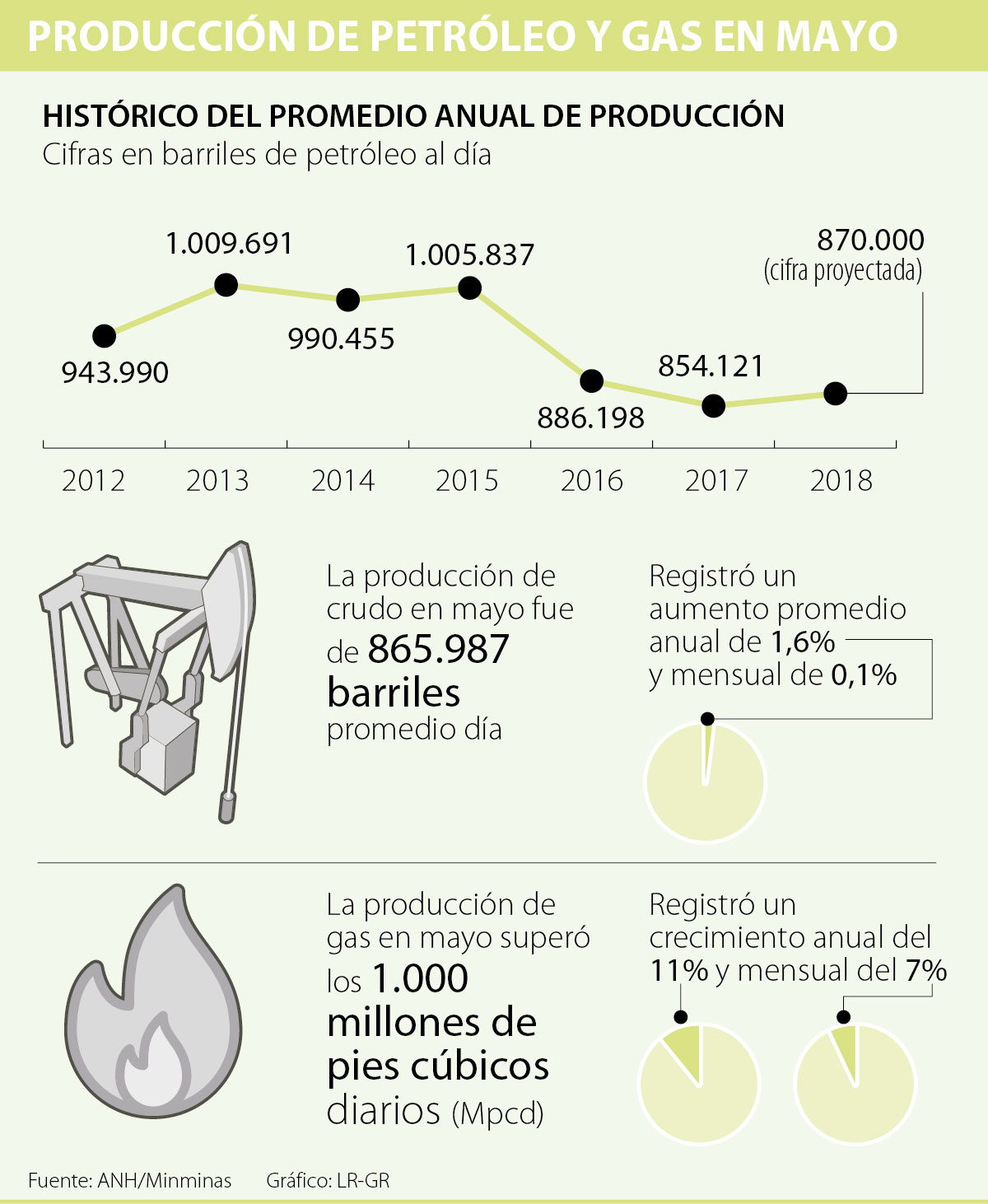 De acuerdo con la información reportada por el Ministerio de Minas, en mayo la producción de crudo llegó a los 865.987 barriles diarios (bpd), lo que se traduce en un crecimiento de 1,6% frente a los 853.000 barriles que se produjeron en el mismo mes del año pasado.