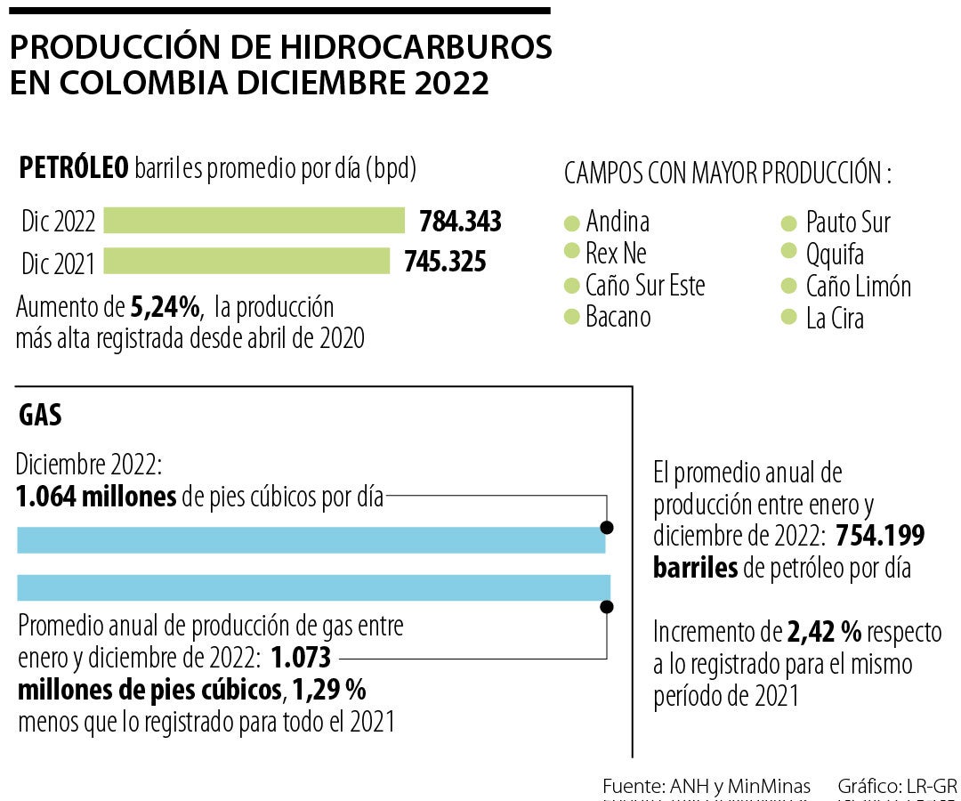 La producción de petróleo en Colombia durante diciembre de 2022 fue de 784.343 barriles promedio por día (bpde), lo que representó un alza de 5,24 % comparada con en el mismo mes de 2021 cuando alcanzó los 745.325 barriles diarios. Esta fue la producción más alta registrada desde abril de 2020.