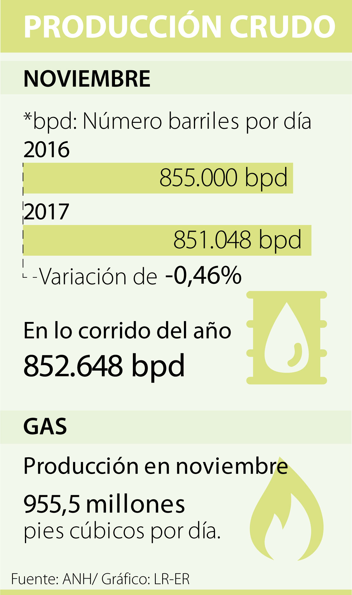 La producción de petróleo durante noviembre fue de 851.048 barriles diarios, según el Ministerio de Minas y Energía. Esto representa una caída de 0,46%, si se compara con la cifra reportada en el mismo mes del año anterior, donde se alcanzaron 855.000.