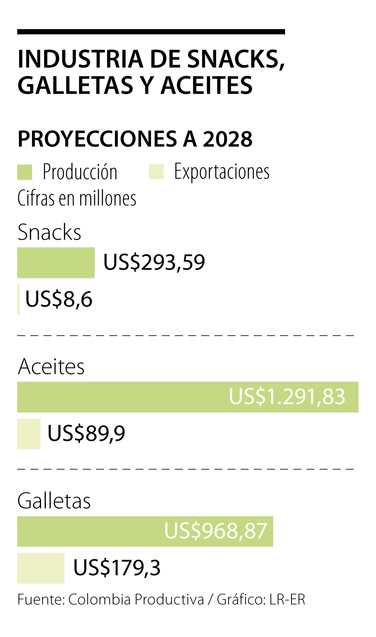 La industria de alimentos aporta 3,8% del PIB, y el Gobierno adelanta un plan de negocios, por medio de Colombia Productiva, para potenciar la producción y las exportaciones en la próxima década en categorías con potencial, como los snacks, aceites y galletería.