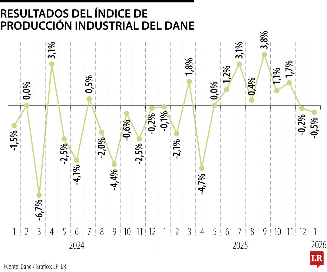 El Departamento Administrativo Nacional de Estadística compartió los resultados del Índice de Producción Industrial correspondientes a enero. Los datos dan cuenta de una variación de -0,5% en el inicio de 2026, que concreta dos meses al hilo en terreno negativo.