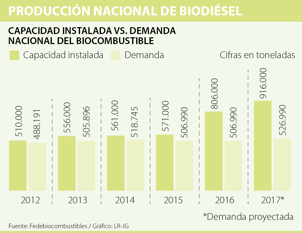 Pero aunque la producción de biodiésel en 2016 tan solo llegó a 447.768 toneladas, una caída de 12,7% con respecto a 2015, y la demanda estimada del biocombustible para este año está proyectada en 526.990 toneladas, los gremios aseguran que no sería necesaria la importación, si se tiene en cuenta que las plantas del país tienen una capacidad instalada de producción superior a las 800.000 toneladas.