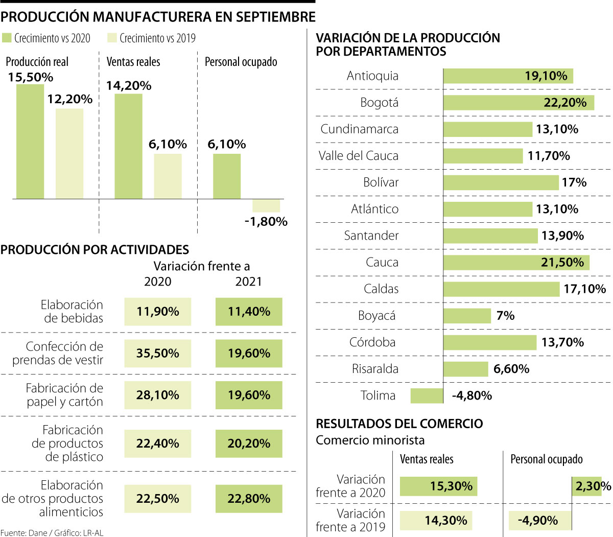 “El crecimiento de 15,5% en la producción real manufacturera en septiembre es un ajuste frente al nivel que vimos en agosto de este año, donde veíamos un crecimiento de 22,9%, pero si nos comparamos con el mes manufacturero promedio de 2018, septiembre de 2021 estuvo en un nivel de producción de 17,4% superior a ese mes promedio de 2018, lo cual es una señal muy importante de reactivación manufacturera del país”, aseguró el director del Dane, Juan Daniel Oviedo.