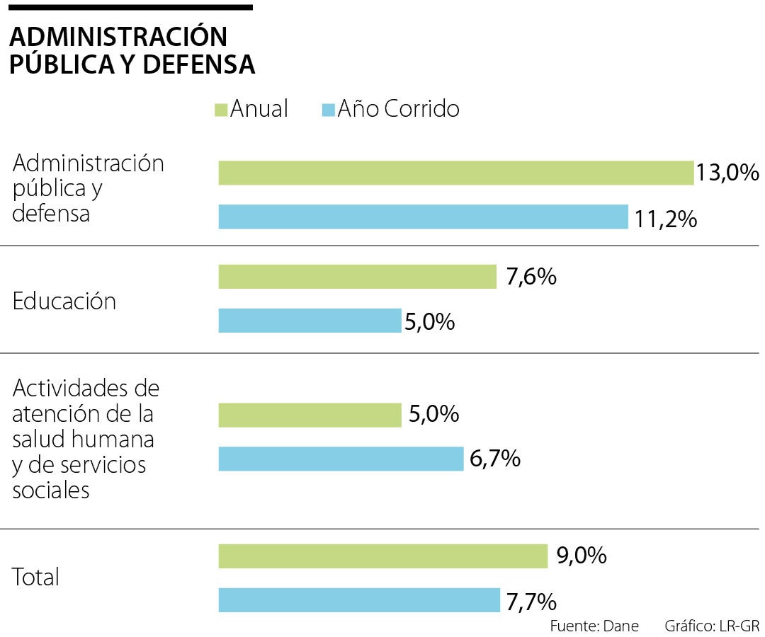 En el segundo trimestre, el valor agregado de la administración pública y defensa, que ocupa también los planes de seguridad social de afiliación obligatoria; educación, servicios sociales, entre otros fue de 9,0%, para aportar 1,6 p.p. al crecimiento en general.