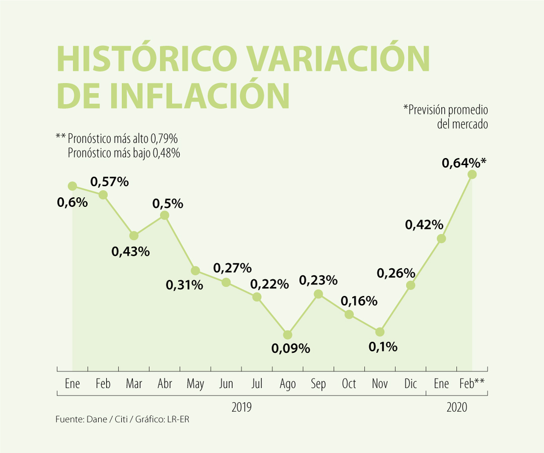 Para el dato del IPC de febrero que hoy revelará el Departamento Administrativo Nacional de Estadística (Dane) las firmas del mercado, según la última encuesta de expectativas del Citi, prevén que el alza sea, en promedio, de 0,64%, lo que situaría el comportamiento de los precios en niveles que no se ven desde comienzos del año anterior.