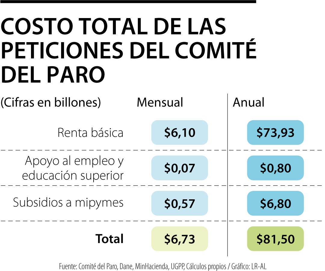 Las demandas de los dirigentes de las protestas incluyen una renta básica para las familias pobres, acciones concretas contra el desempleo y la pobreza, retirar un proyecto de reforma a la salud y mejoras en la educación, así como el cese de la violencia contra líderes sociales, entre otros.
