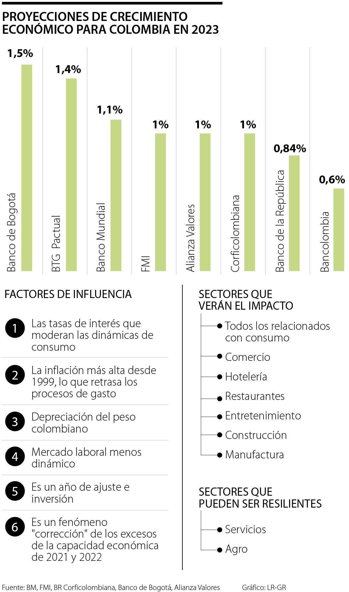 En el marco local, el Banco de la República actualizó en marzo el dato sobre el crecimiento del PIB para 2023 y pasó a 0,84%. Mientras que el Banco Mundial este mes puso una proyección de 1,1%. Y, por su parte, el FMI posicionó a Colombia como la economía que menos crecerá en la región con 1% .