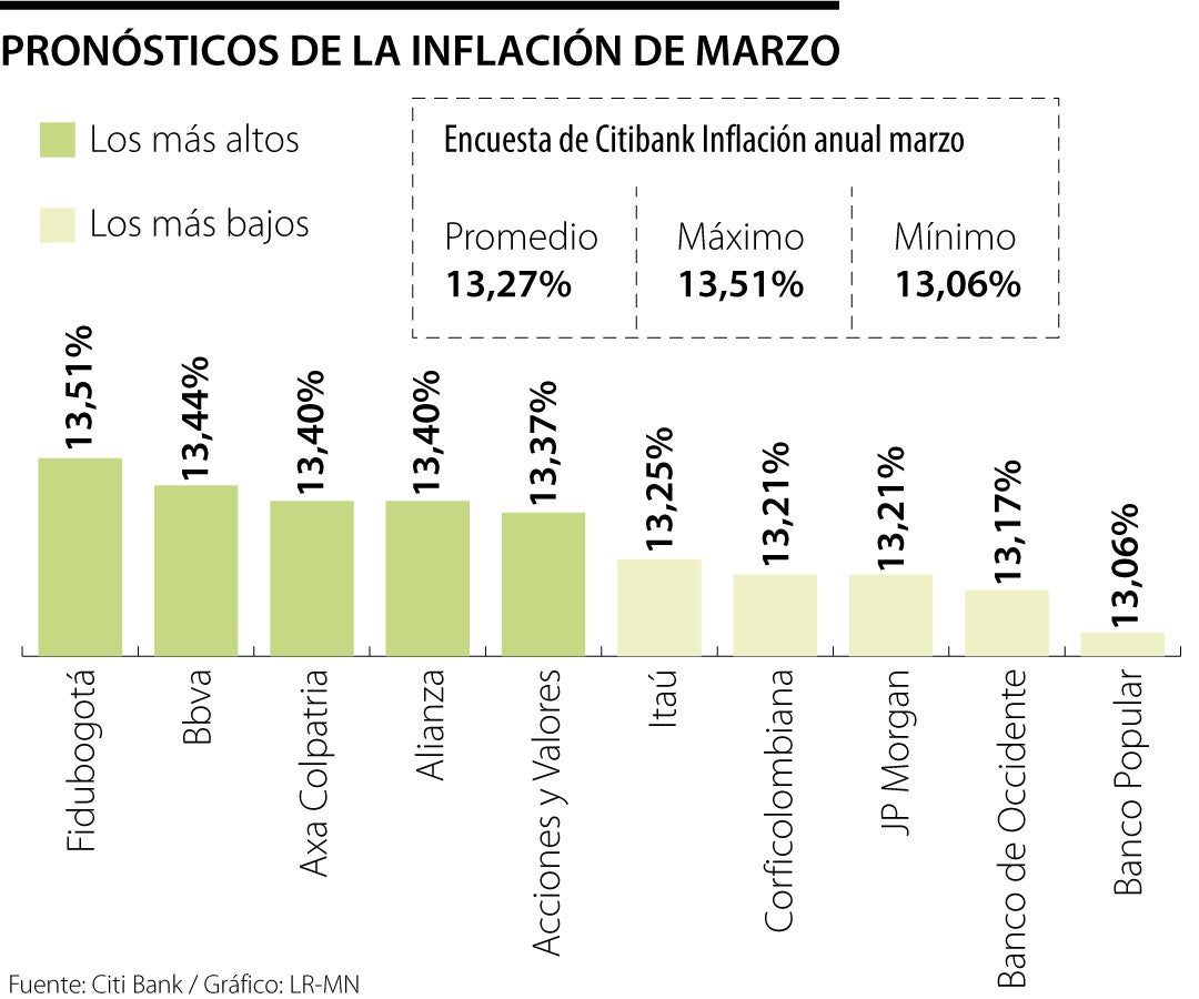 Por el contrario, Alianza considera que la inflación se puede acelerar en marzo con un nivel de 13,40%. Sin embargo, esperan que en este mes terminen los incrementos y empiece a ceder. "Esperamos que de ahí en adelante se dé un periodo de estabilización, para posteriormente poder evidenciar recortes. Nuestra expectativa es que cerremos el año cerca de una inflación de 9%. Para el mes de marzo fueron clave los sectores de vivienda y transporte", explicó David Cubides, analista de la entidad.