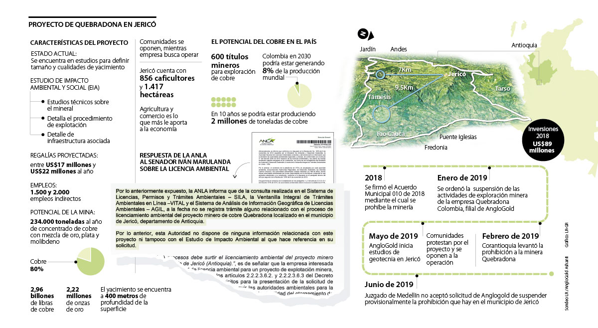 Según la Agencia Nacional de Licencias Ambientales (Anla), “a la fecha no se registra trámite alguno relacionado con el proceso de licenciamiento ambiental del proyecto minero de cobre Quebradona localizado en el municipio de Jericó, departamento de Antioquia”.