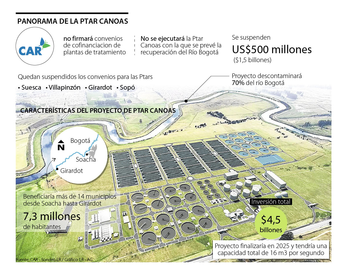 La decisión de frenar el proyecto se da semanas después de que la CAR le diera luz verde a la Ptar Canoas. En ese momento, dicha entidad estableció que esa construcción tendría una inversión de $4,5 billones, en los cuales la Alcaldía de Bogotá aportaría $2,94 billones; la CAR, $1,5 billones (US$500 millones); y la Gobernación de Cundinamarca, $61.000 millones.