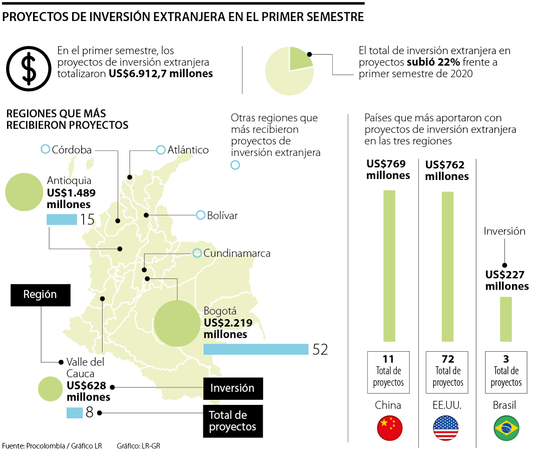De acuerdo con ProColombia, entre enero y junio, 110 proyectos llegaron al país con nuevas inversiones y reinversiones con montos que ascienden a US$6.912,7 millones, cifra que representa un 22% más que lo registrado en el mismo periodo de 2020, cuando arribaron 103 iniciativas con negocios por US$5.647 millones.