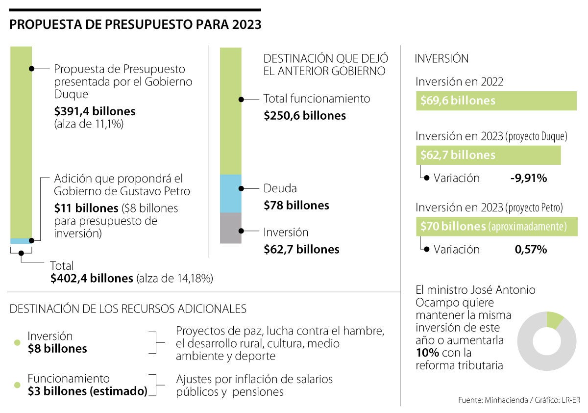 En las comisiones económicas ya reposa un articulado presentado por el anterior ministro de Hacienda, José Manuel Restrepo, por $391,4 billones. Pero con la adición que propone el nuevo gobierno, el presupuesto del próximo año pasaría a $402,4 billones. Monto que debe ser aprobado por el Congreso antes del 14 de octubre.