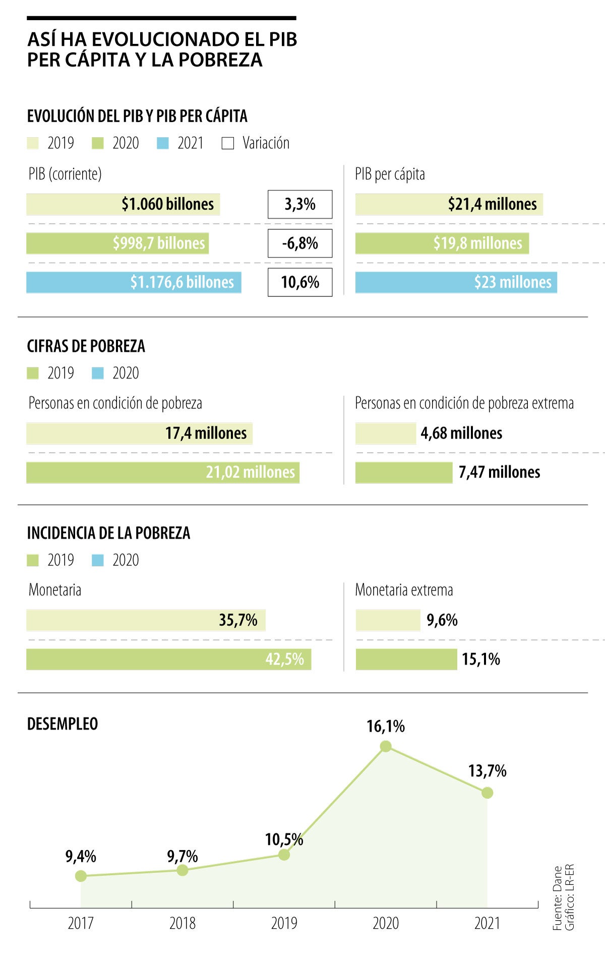 En febrero, el Departamento Administrativo Nacional de Estadística (Dane) reveló que el PIB había crecido 10,6% durante 2021. Esta cifra, al desagregarse por persona, muestra que el crecimiento en fue de $3,2 millones.