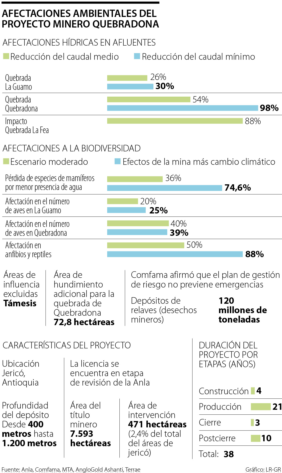 Las quebradas La Guamo y Quebradona iban a ser afectadas 30% y 98%, respectivamente, lo que fue otro de los aspectos a tener en cuenta por la autoridad ambiental, además de las afectaciones a la biodiversidad.