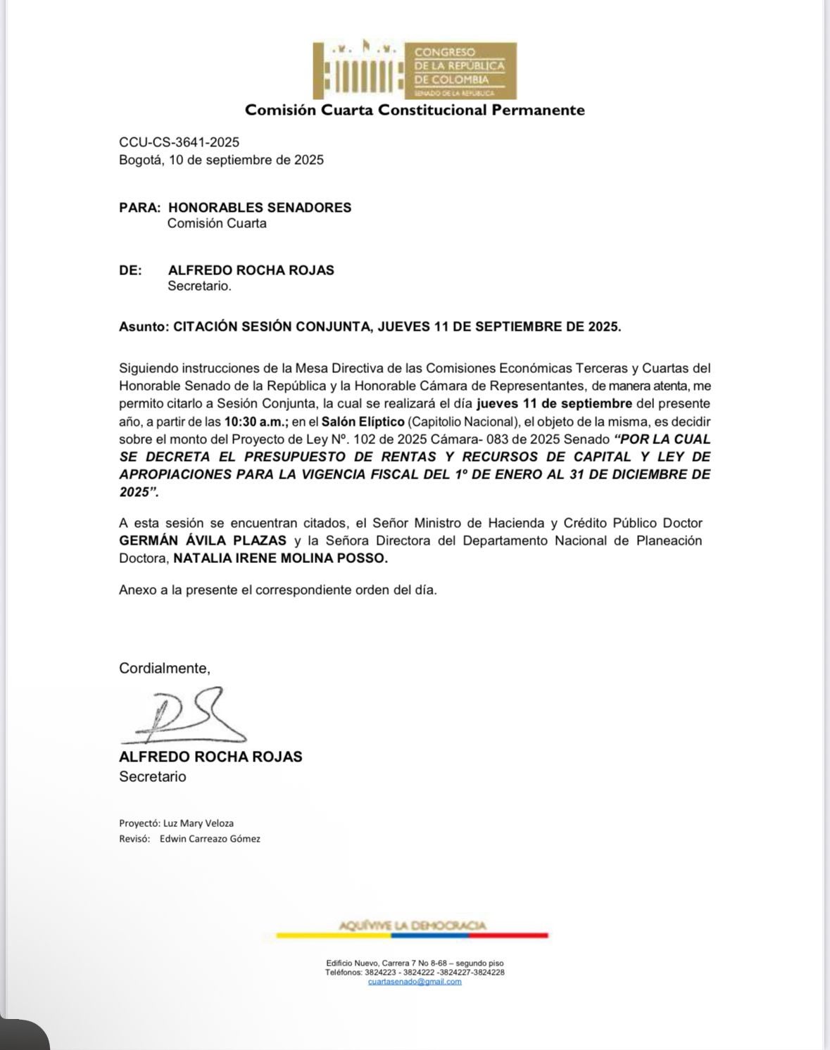 Hoy se citó nuevamente a una sesión conjunta de las comisiones económicas del Senado y la Cámara de Representantes, en la que también participarán el ministro de Hacienda, Germán Ávila, y la directora del Departamento Nacional de Planeación, DNP, Natalia Molina, en el que se podría definir el monto del Presupuesto General de la Nación de 2026.