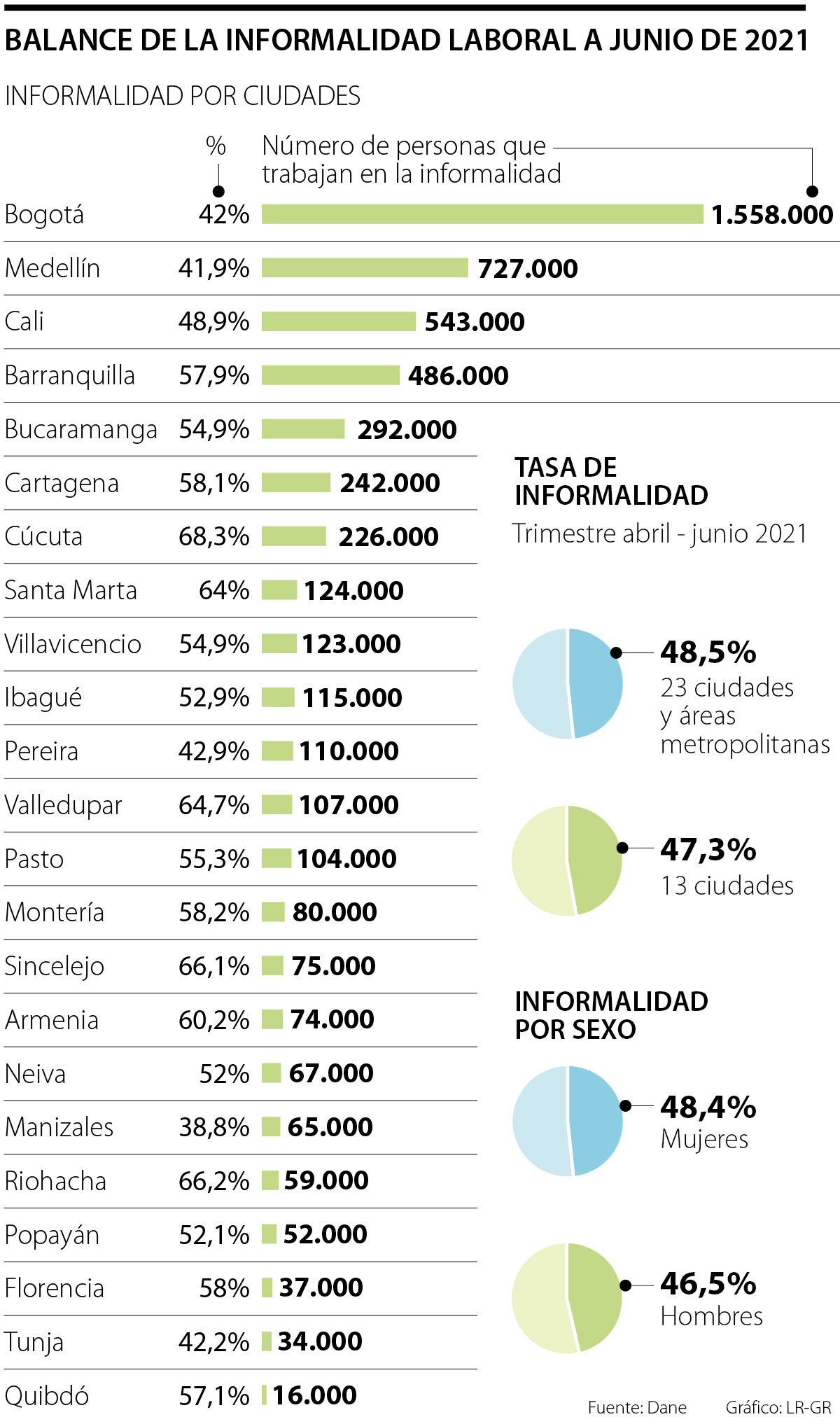 De acuerdo con las cifras del Dane, las ciudades en las que se registraron las menores cifras de informalidad fueron Manizales (38,8%) y Medellín (41,9%).