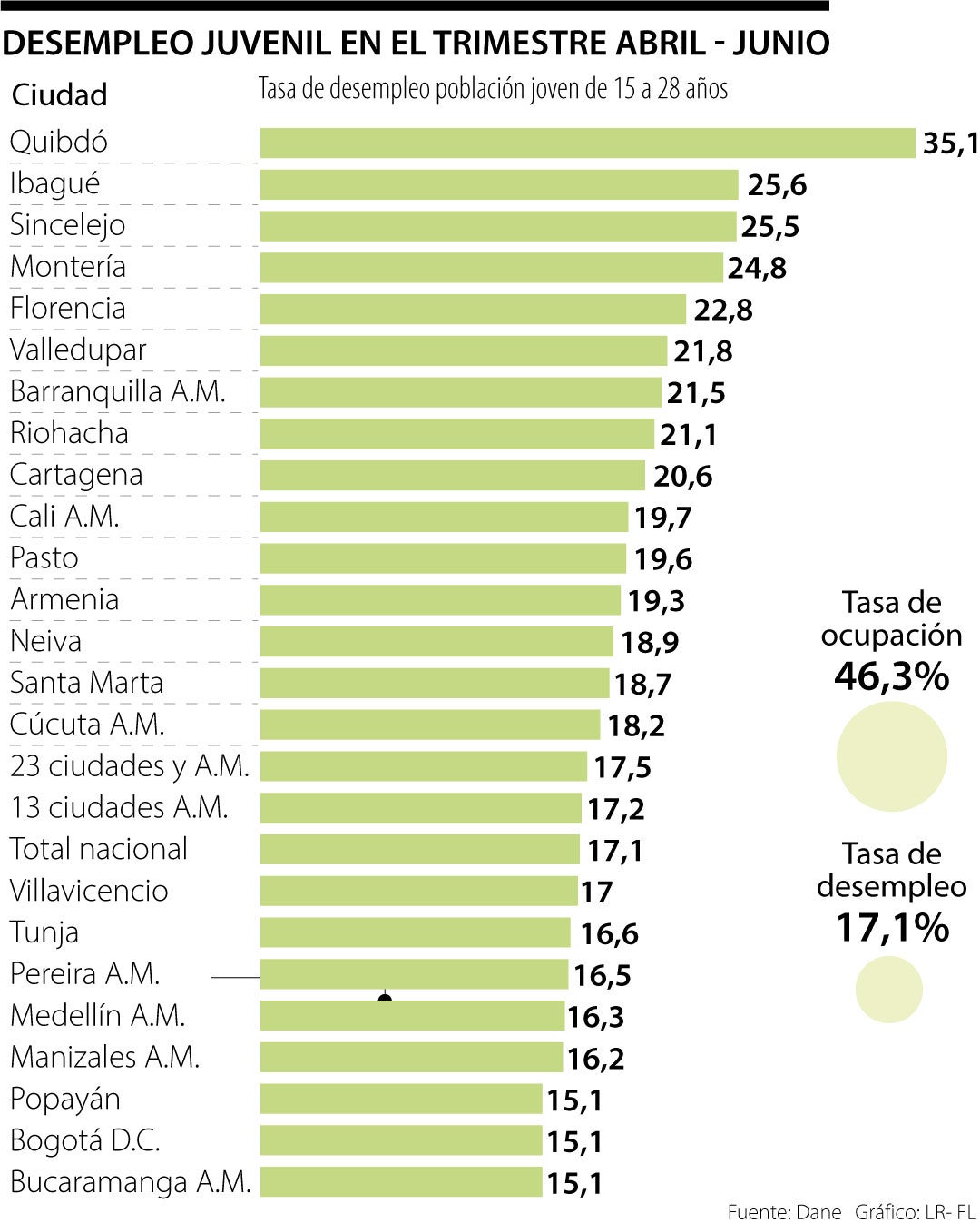 Además, el informe demuestra que Quibdó es la ciudad con más tasa de desempleo juvenil (35,1%), seguido de Ibagué con 25,6% y de Sincelejo con 24,8%. Por otro lado, las ciudades con menos población joven desempleada son Popayán con 15,1%, Bogotá con 15,1% y Bucaramanga con 15,1%.