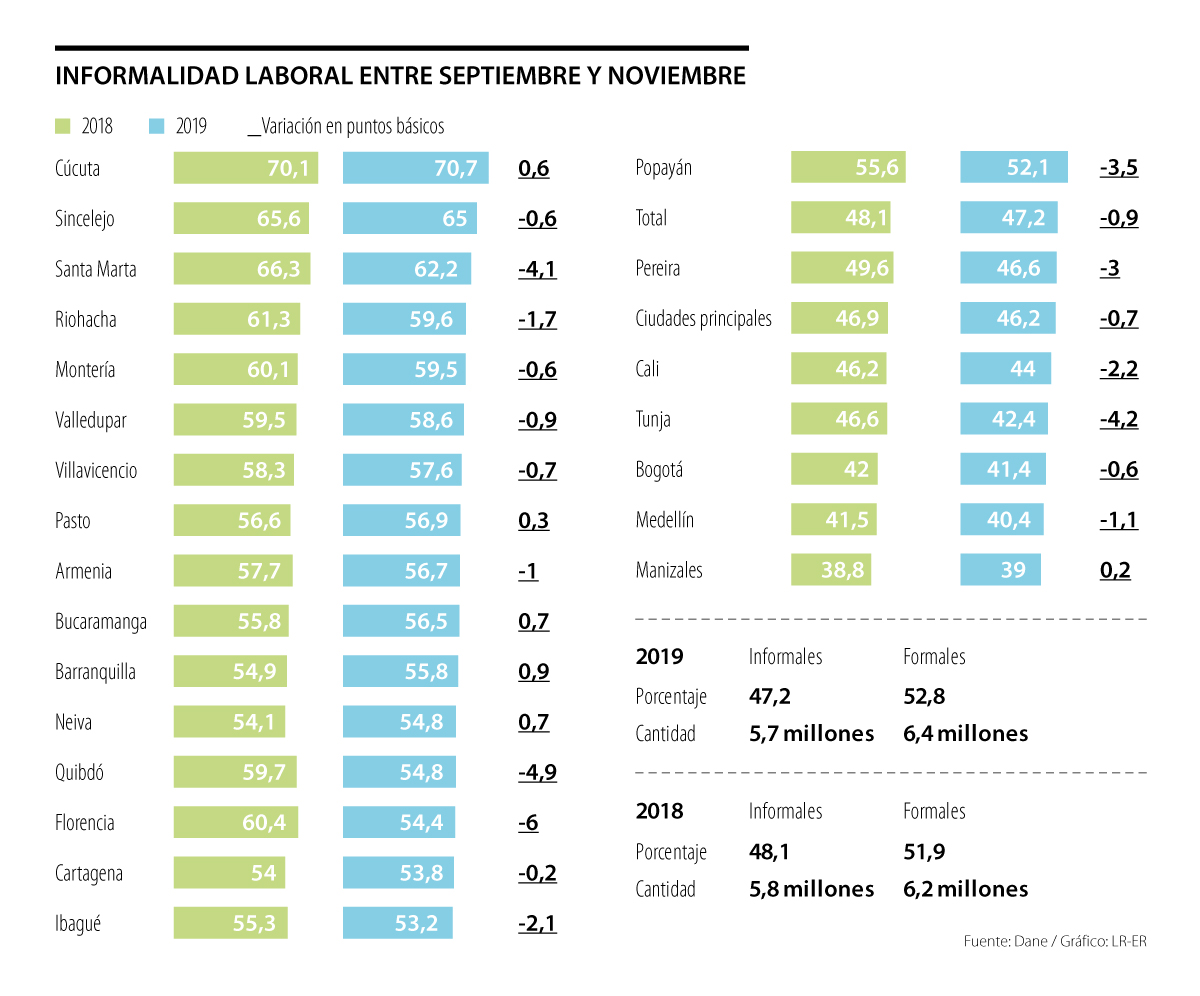 Según el documento, las tasas para 2019 en estas ciudades fueron de 54,8%, 42,4% y 62,2%, respectivamente, mientas que en 2018 fueron de 59,7%, 46,6% y 66,3%, también en ese orden. Así las cosas, la reducción de la informalidad en Quibdó fue de 4,9 puntos; en Tunja, de 4,2 puntos y en Santa Marta, de 4,1 puntos.