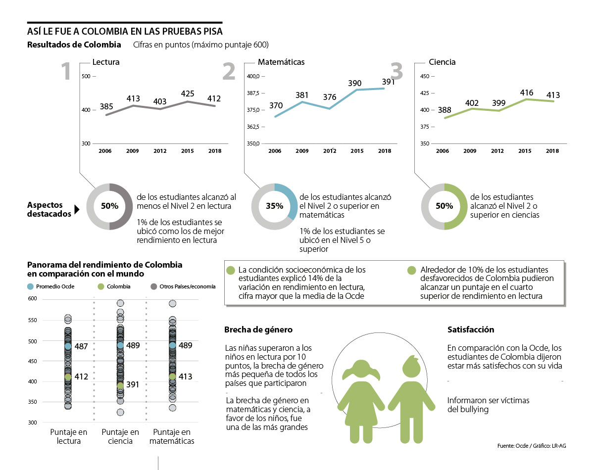 En cuanto a lectura, el resultado de Colombia fue de 412 puntos, estando 75 puntos por debajo del promedio y logrando 13 puntos menos que en 2015. Por su parte, en las pruebas de ciencia, que fue la mejor lograda de los tres segmentos en términos generales, el país consiguió 413 puntos, tres menos que en 2015 y 76 por debajo del promedio Ocde.