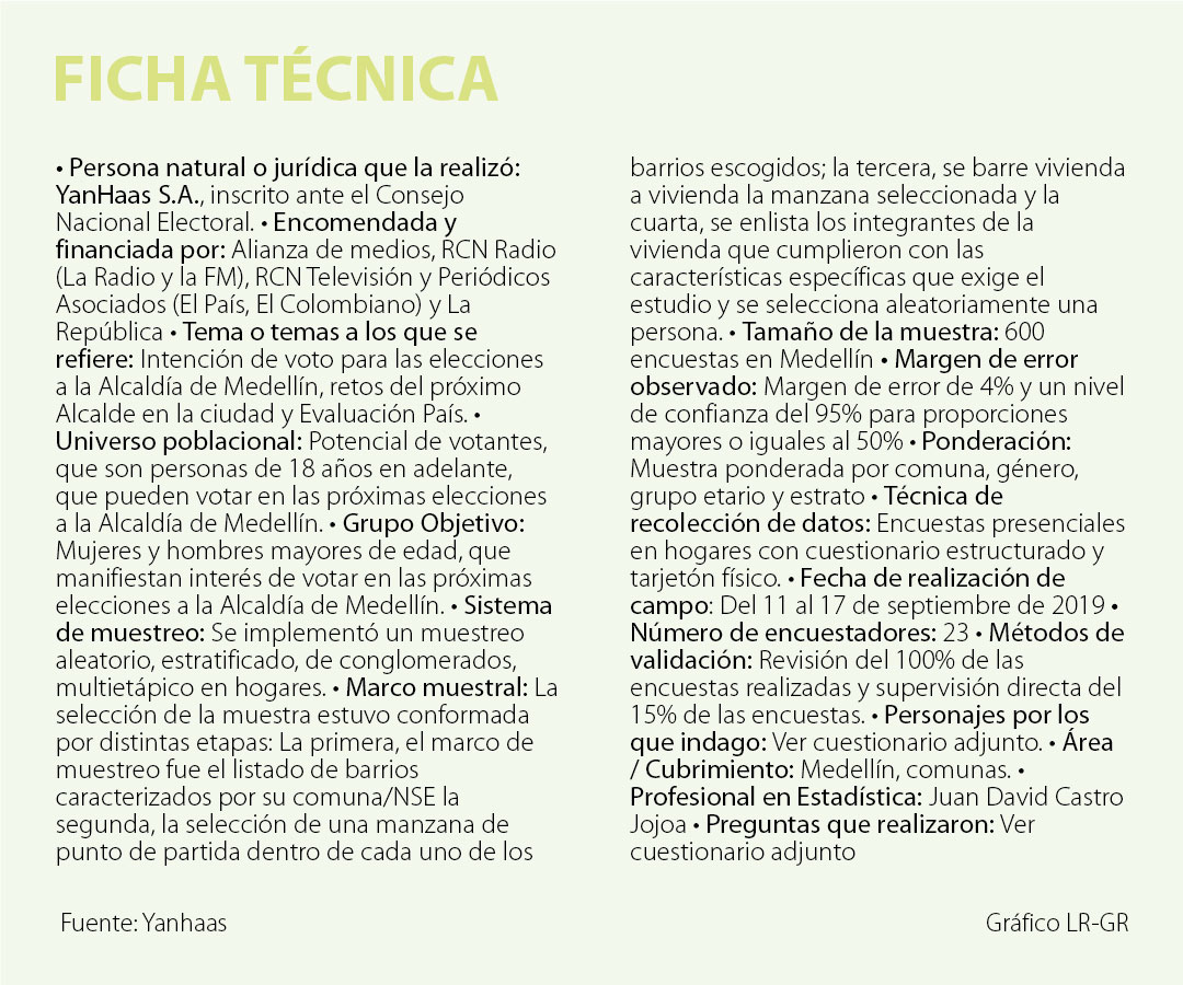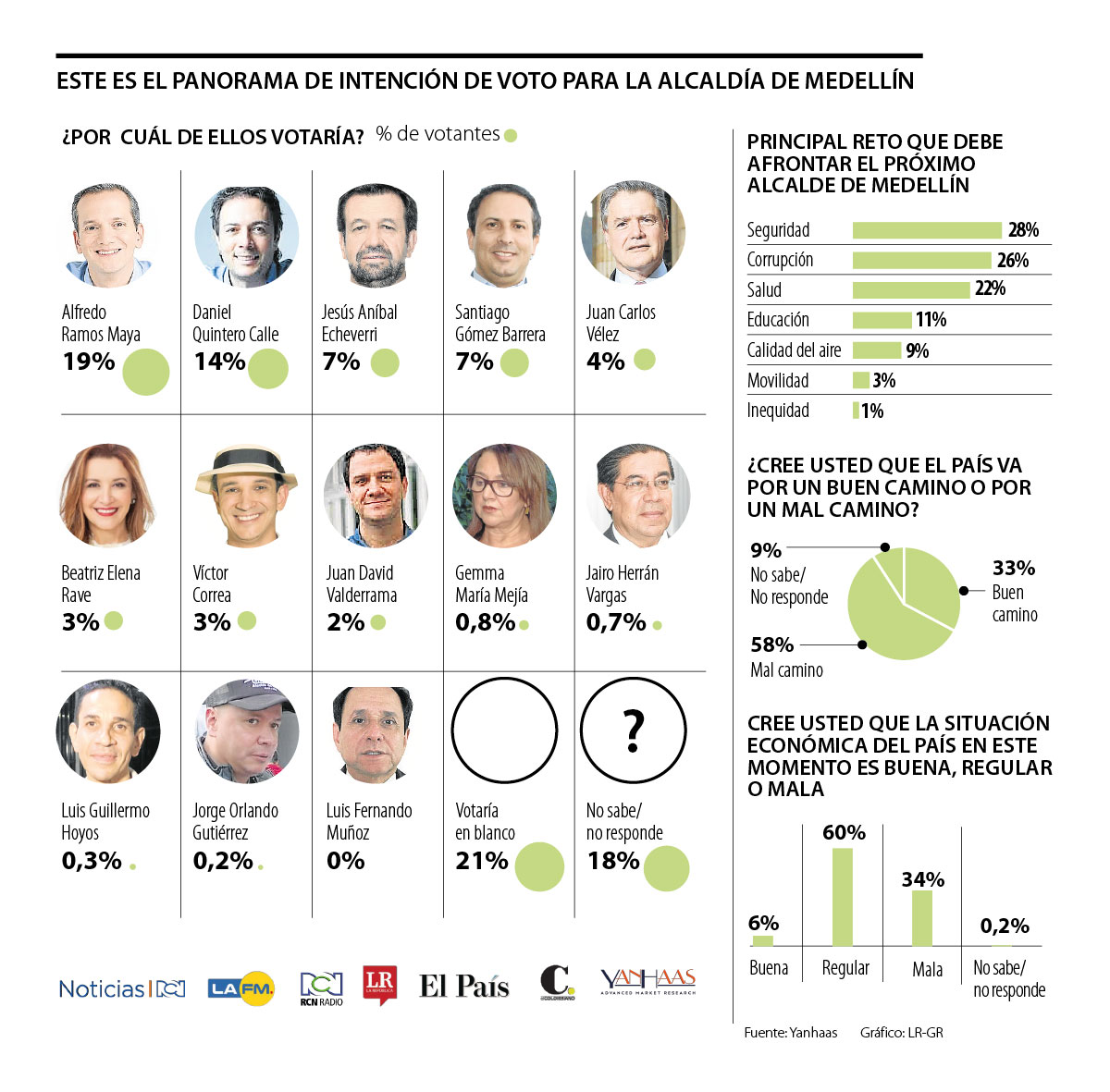 De acuerdo con los resultados de La Gran Encuesta, realizada por La República, Noticias RCN, La FM y RCN Radio, el candidato Alfredo Ramos Maya continúa liderando la carrera por la Alcaldía de Medellín, con 19% de intención de voto entre los encuestados.
