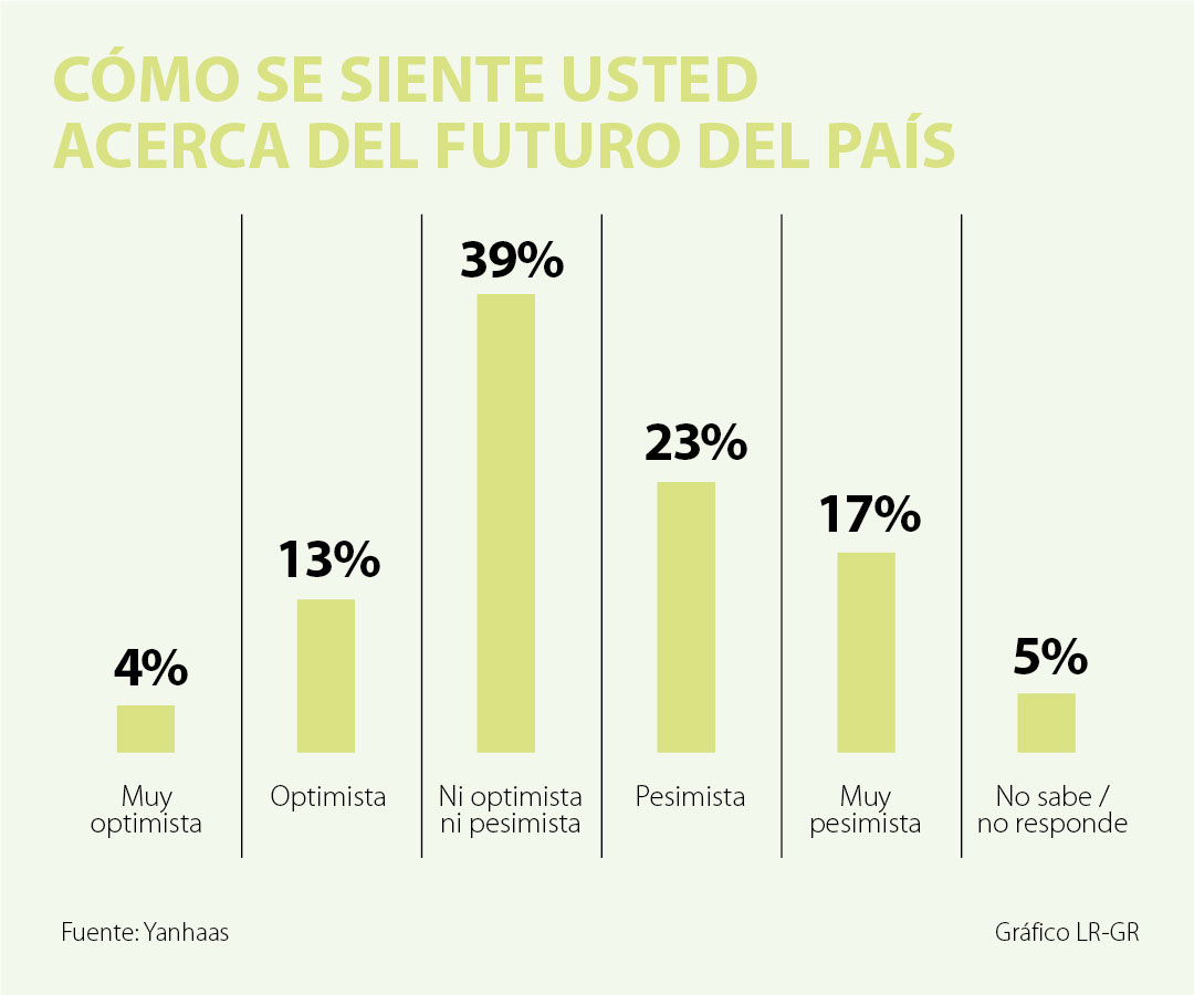 Al desagregar por estratos, la proporción más alta de quienes creen que la economía va regular está en el estrato 6 y en el rango de edad de los mayores de 55 años. Sobre el futuro del país, 39% no es ni optimista, ni pesimista, y solo 13% es optimista y 4% muy optimista. Si se suman quienes son pesimistas y muy pesimistas el porcentaje llega hasta 40%.