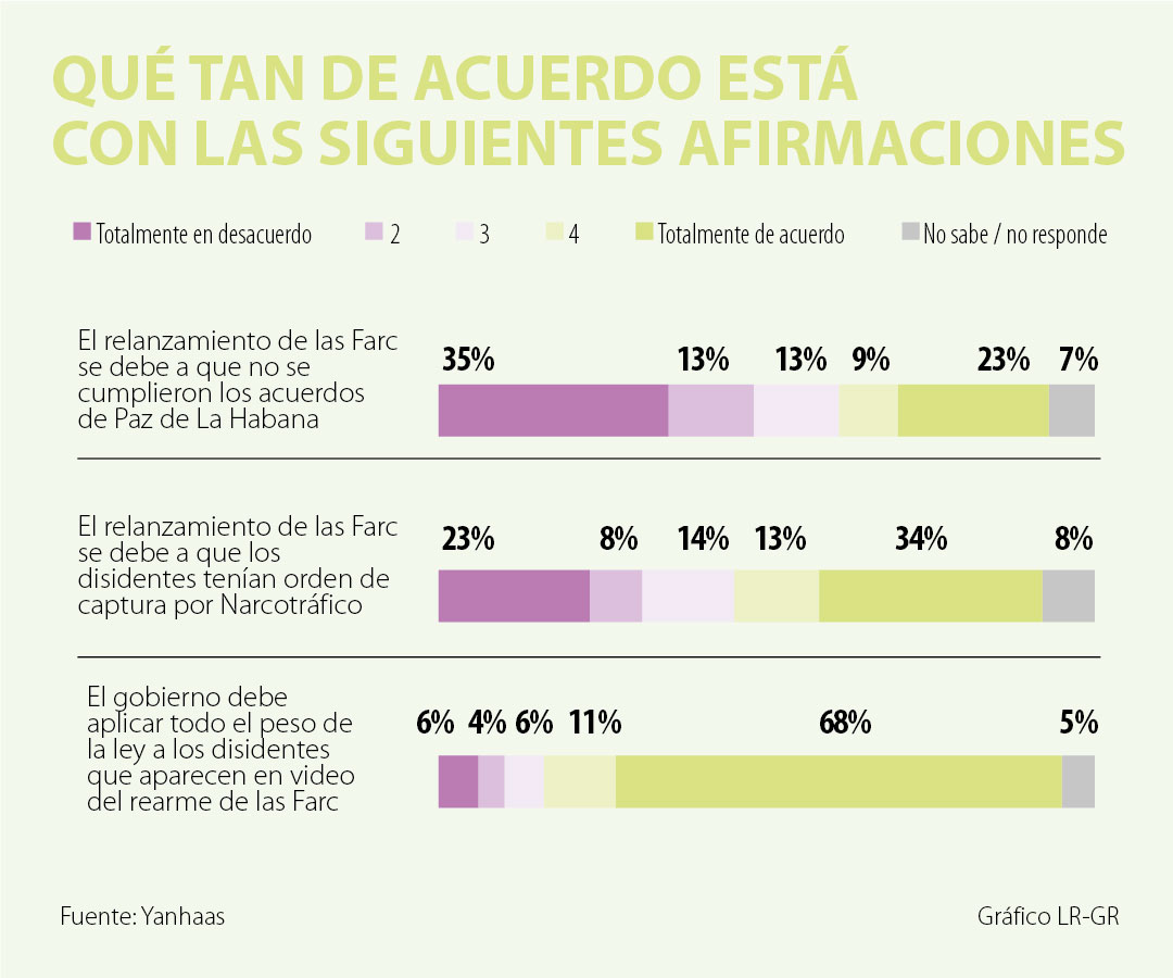 Adicionalmente, 34% cree que este relanzamiento se debe a que los disidentes de las Farc tenían orden de captura por narcotráfico y 68% afirma que el Gobierno debe aplicar todo el peso de la ley a los disidentes que salieron en el video del rearme liderado por alias 'Iván Márquez'.