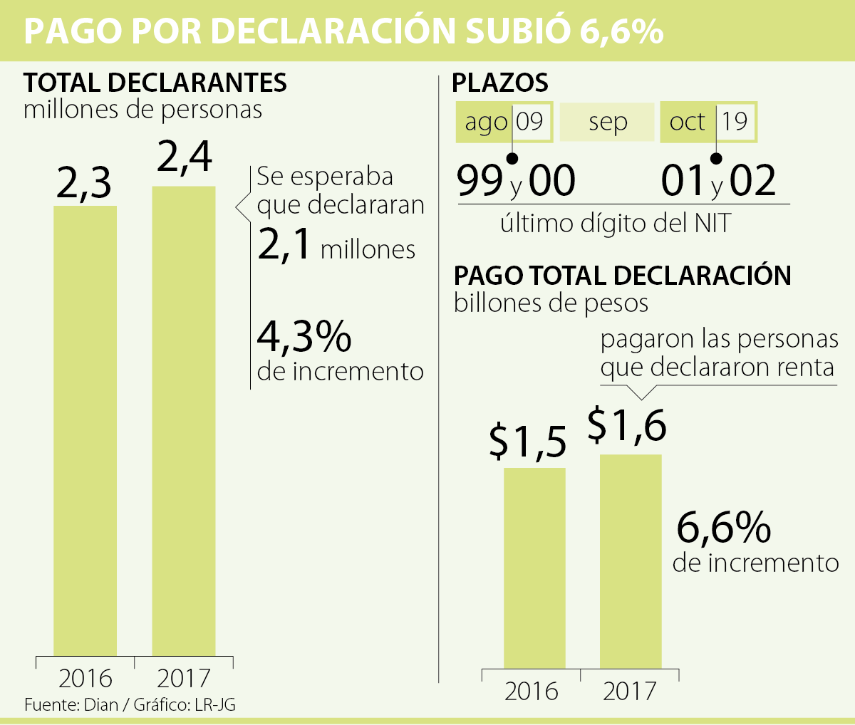 Durante 71 días, más de 2,4 millones de colombianos hicieron su declaración de renta del año gravable 2016. De acuerdo con un informe que publicó la Dirección de Impuestos y Aduanas Nacionales de Colombia (Dian) el pago aumentó 6,6% respecto a 2016, ya que los contribuyentes cancelaron $1,6 billones este año, mientras que el periodo anterior fue $1,5 billones.